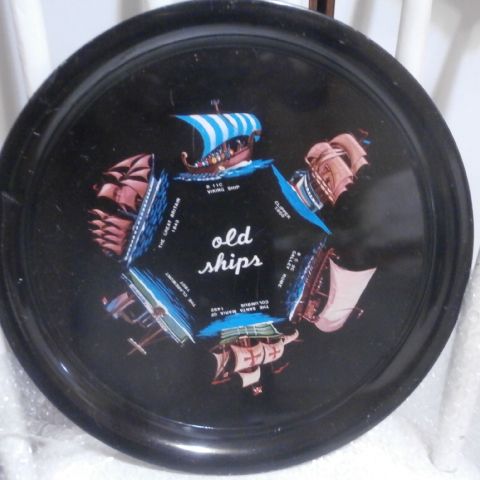 Peltitarjotin 1. Vanha sini/beigesävyinen pyöreä tarjotin