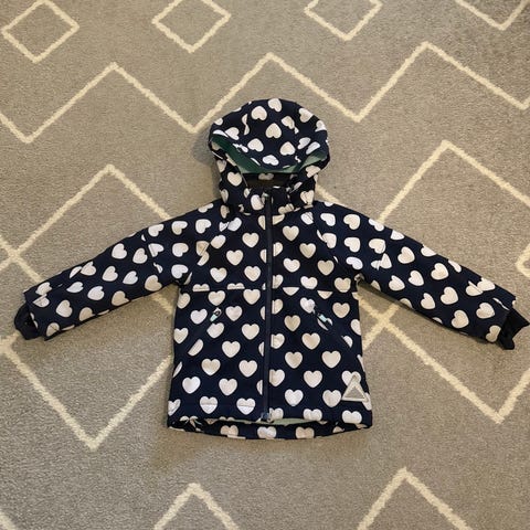 Ehjä softshell takki koko 98, hieman keltaisissa vetoketjuissa tummentumaa.