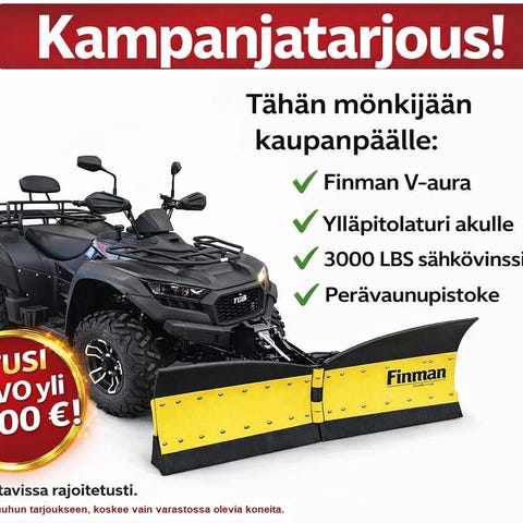 Lisävarusteet monipuolistavat mönkijän käyttöä niin talvi- kuin kesäkautena. Esim. Finman Nivelaura sopii erityisesti isojen ja pienten piha-alueiden lumiurakointiin. Peräkärryllä hoidat polttopuukuormat, jne. Saatavilla myös kahvanlämmittimet ja takaboksit, Finman työkoneet. Pyydä tarjous haluamillasi varusteilla myynnistä.