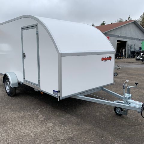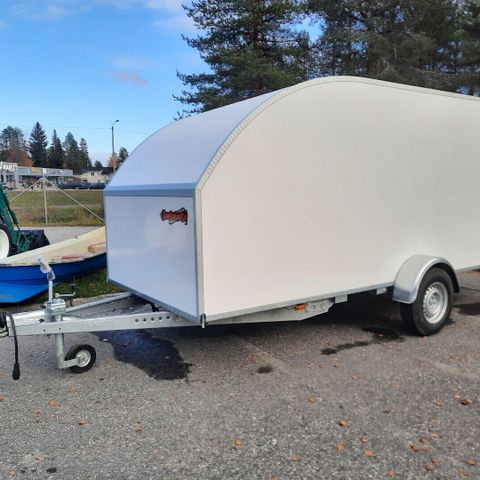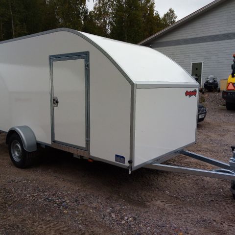 Runko valmistetaan ja kuumasinkitään Suomessa. Takaluukku alasaukeavilla jousilla avautuu ajosillaksi, lukollinen käyntiovi oikealla.