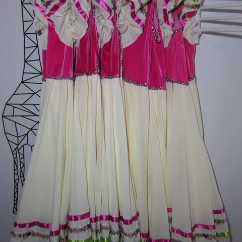 sekin on tehty helmistä ja paljeteista jotka ommellen kiinnitetty pukuun.