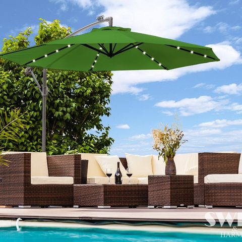 Tämän aurinkovarjon alla nautit kesästä pikkutunneille saakka! Aurinkovarjossa on 40 LED-lamppua jotka tuovat uskomatonta tunnelmaa auringon laskun aikaan ja sen jälkeen. Valaistus laututuu päivällä aurinkokennon avulla, joten sähkölaskukaan ei kasva. Valaistus voidaan kytkeä päälle ja pois manuaalisesti.