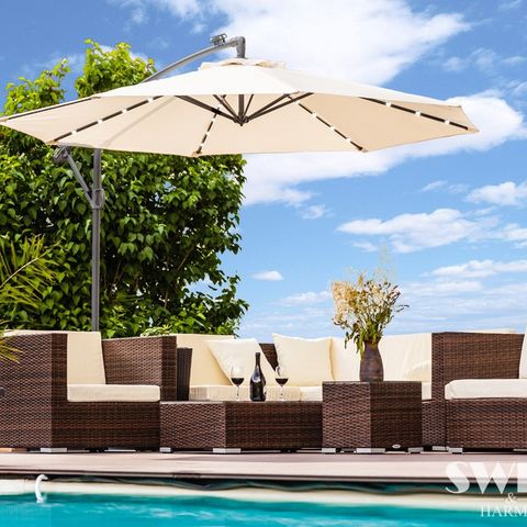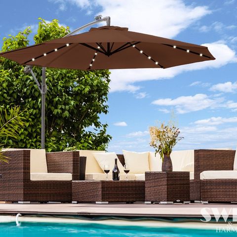 Tämän aurinkovarjon alla nautit kesästä pikkutunneille saakka! Aurinkovarjossa on 40 LED-lamppua jotka tuovat uskomatonta tunnelmaa auringon laskun aikaan ja sen jälkeen. Valaistus laututuu päivällä aurinkokennon avulla, joten sähkölaskukaan ei kasva. Valaistus voidaan kytkeä päälle ja pois manuaalisesti.