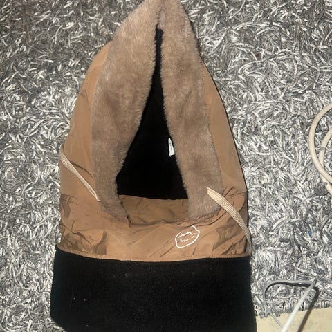 Jalkapussi pyörätuolissa ulkoiluun. Irroitettava teddykarvainen lämpöpussi. Suomen laitostekstiili Oy:n valmistama.