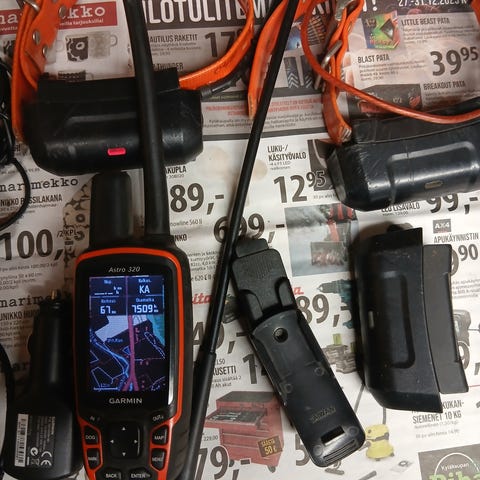 Siistikuntoinen 6 vuotta vanha Garmin Alpha 100 koiratutkapaketti T5 ja T5 mini pannoilla.T5 panta ollut koiraliivissä kiinni ja siinä akku alkaa olla pian vaihtokunnossa(kestää 6-7 tuntia