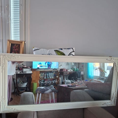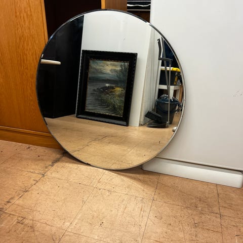 Lasireunuksella oleva kylpyhuoneen peili. Kiinnitys osat teipattu takapuolella, ruuvit mukana.
