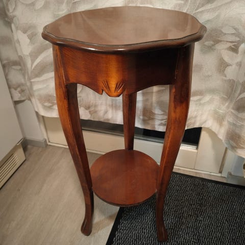 Vanha puinen kukkateline. Noin metrin korkuinen, kannattelee 6 kukkaruukkua. Hyvässä kunnossa muuten, mutta yksi telineissä puuttuu ja lakka on paikoittain kulunut/naarmuilla.