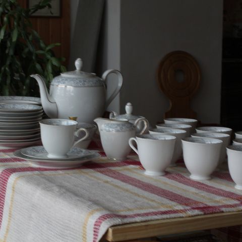 Kaunis vanha kahviastiasto kermakolla ja kahvikannulla. 50-60-lukua