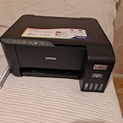 Epsonin mustesuihkutulostin, skanneri ja kopiokone. Toimii langattomasti ja piuhalla. Vaihdoin uudet tarvikepatruunat, mutta kohta pitäisi kuulemma vaihtaa huoltolaatikkokin. Punaisessa värikanavassa joku tukos.