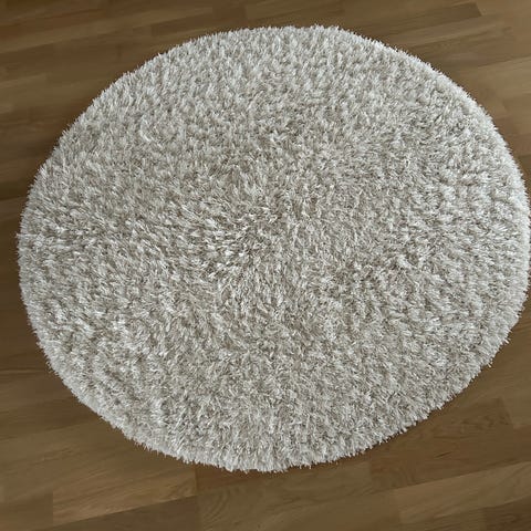 Beige nukkamatto halkaisija 80 cm. Teetetty laadukkaasta ja kestävästä matosta mattoliikkeessä. Reuna nauhakantattu siistiksi. Kanttaus jää kuvissa piiloon nukan alle. Nukassa hieman elävyyttä värissä (eri beigen/ruskean sävyjä langassa).