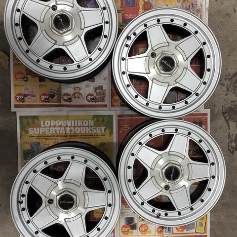 15 tuumaset, 7" leveät. Fordin jako, 4x108 vissiin. Ollut -80 luvun thunedrbirdin että taunuksen alla. Tarvisee putsaamista jos hienot haluaa, on kolhujakin. Viimeksi kun olivat käytössä kaksi vannetta tarvi sisäkumin, kerta vanteen ja kumin välistä falskasi.