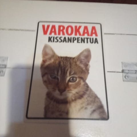 Laminoituja muovisia/säänkestäviä kissa-aiheisia kylttejä. 1 e/kpl.