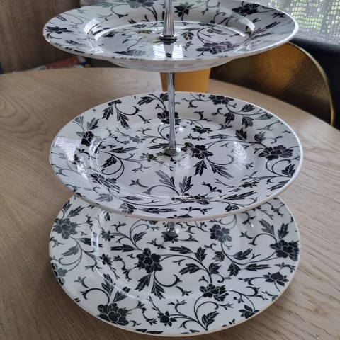 Tarjoiluastiat kukkakuvioin, musta-punaiset. 5€