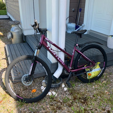 Merida maastopyörä naisille, 26" renkaat. Pyörässä on etujousitus, levyjarrut ja monivaihteinen vaihteisto kierrettävällä vaihdevivulla. Rungon väri on valkoinen vaaleilla tehosteilla. Kuvissa näkyy myös valkoinen satula ja polkimet sekä maastokäyttöön sopivat renkaat. Mukana on juomapulloteline ja soittokello. Pyörä soveltuu maastossa ja sorateillä ajoon sekä yleiseen arkiajoon.Pyöräilykypärä ja lukko sekä kori kuuluu hintaan.
