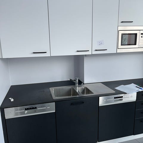 Pieni keittiö, allaskaappi (ei allasta mukana) ja yläkaappi sekä kulmahylly. Allaskaapin vieressä vielä ulosvedettävä hyllykkö.