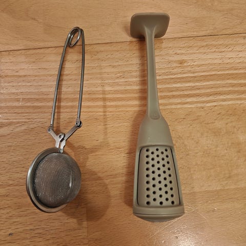 Ostan Tupperware teekannun pienen muoviosan, jolla teepallon saa pysymään varressa kiinni.