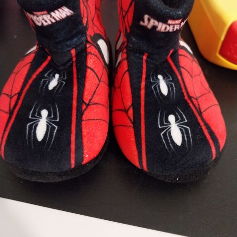 Pienelle supersankarille tossut (ei koko merkintää, oisko koko n. 20-22? 3-vuotiaalle sopivat, pohjan pituus ulkopuolelta 16cm (ks. kuva), ja housut koko 104cm.