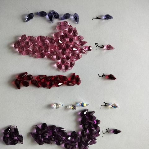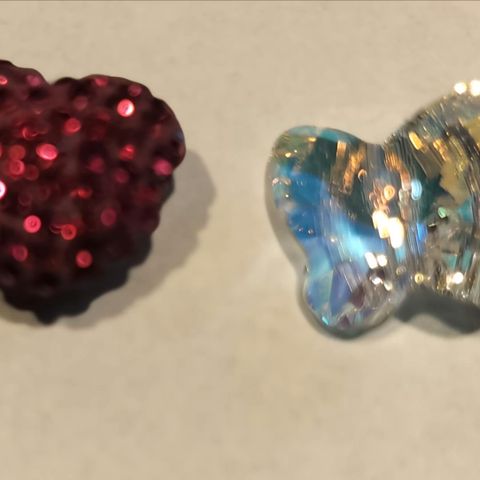 1) Punaiset prismat 38mm 5 kpl, 2) kirkas 38mm 3 kpl 3) mustat 22mm 5 kpl 4) kimalle 22mm 5 kpl 5) kirkas 22 mm 5 kpl 6) pisara 38mm 2 kpl. Hinnat: 38mm 40 snt/kpl, 22mm 30 snt/kpl. Ei toridiiliä. Nouto tai posti