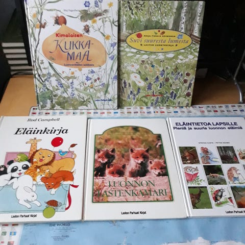 Pienet tieto- ja leikki kirjat. Kukkamaa kirjassa paljon tietoa yleisemmistä kasveista ja kukista. Hyvät selkeät kuvat. Tuuli- ja Vesikirjasessa (= uusia) mukavia ideoita ja askareita.