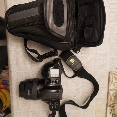 Minolta Dynax 500 si filmikamera ja Lowepro nova 2 kameralaukku