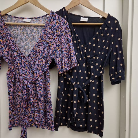 3kpl 2/3 hihalla olevia äitiyspaitoja, kaikki kerralla. Mustavalkoisessa kainaloiden kohdalla nukkaantumista, pinkissä toisessa hihassa pieni reikä (näkyy kuvassa ja saa korjattua halutessa) ja oranssissa selän puolella alareunassa sauma lähtenyt rikkoutumaan (näkyy kuvassa).