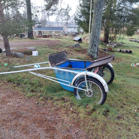 Hyväkuntoiset ja hyvin liikkuvat hevosten harjoituskärryt. Kärryn runko ja aisat ovat metallia.