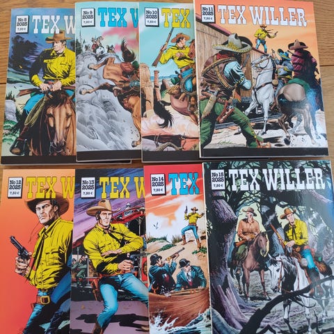 Tex Willer sarjakuva lehtiä 1e kpl. v.1982 no 4,7 v. 1983 no2,3,4,,8,9,,11,13,14 v.1984 no1,2,3,4,5,8 v.1985 no 1,2,5,6,7,9,12,13,14,15,16 v.1987 no 1,2,3,4,5,6,7,8,9,10,11,13,14,15,16 v.1988 no 4,v.1989 no 3.