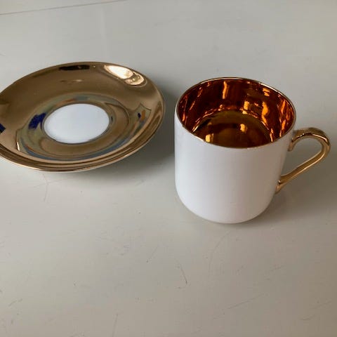 Myydään pieni Arabian kuppi. Kupin sisällä on kultainen lasitus.