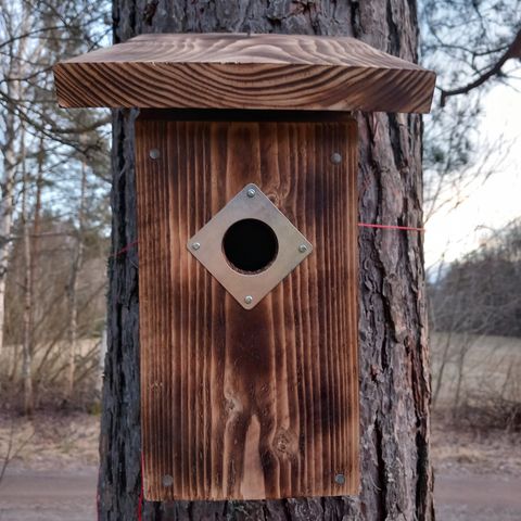 Tervalepästä Birdlifen ohjeen mukaan tehtyjä linnunpönttöjä. Sopii lajeille sinitiainen, kuusitiainen, sekä sahanpurulla täytettynä hömötiaiselle ja töyhtötiaiselle.