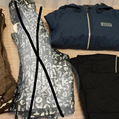 Remun Perhos kuvioinen takki ulkoiluun. Ohut vuori. Huppu on irrotettavissa, taskut edessä, vetoketjut toimii. Ei moitteita.