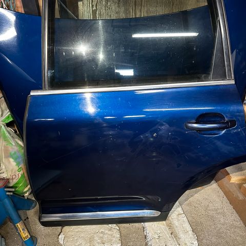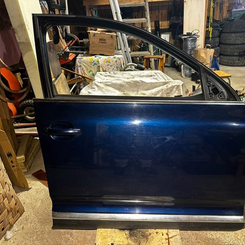 Etuovi verhoiluineen. Lasi on ehjä, mutta oven sisällä. Ei läpiruostetta, mutta jotain pientä ruostetta maalipinnan alla on.