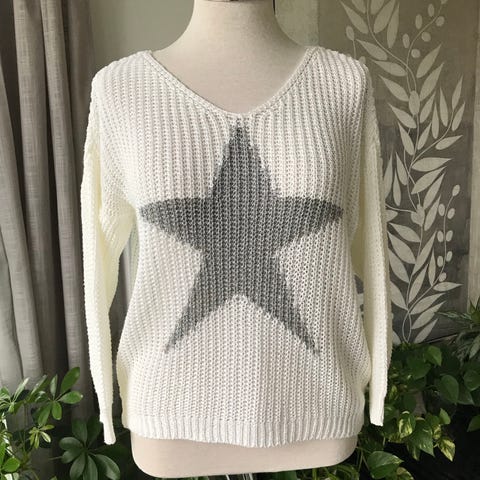 Neule jossa edessä tähti koko S / M, koko sopii 36, 38 kokoa käyttävälle. Värit roosa ja hopea.