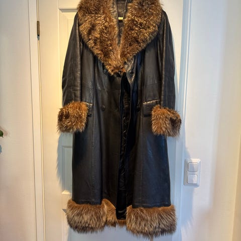Ikäänsä nähden todella hyväkuntoinen, laadukas naisten pitkä nahkatakki. Ehjät saumat ja vuori. Alkuperäiset erikoiset, uniikit napit. Takana halkio. Kauluksen turkki kunnossa, karvaa ei irtoa. Kokolappu sanoo 42 mutta sanoisin ennemminkin 38-40. Vyö puuttuu ja ryppyjä löytyy, huomioitu hinnassa. Nouto Pitäjänmäestä tai kuljetus erikseen sovittaessa Sörnäinen/Vallila -suunnalle
