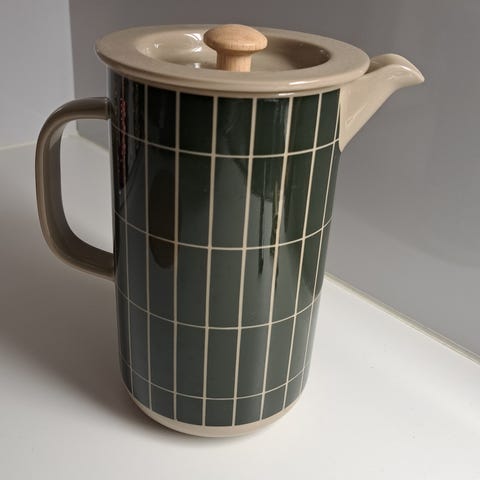 Suosittu tiiliskivi-kuosinen pressopannu on valmistettu ruskeasta keramiikasta, joka on konepesun kestävää. Pannussa on metallinen suodatin ja sillä saa tehtyä noin kuusi kuppia kahvia. Kannessa on puunuppi. Soveltuu myös irtoteelle.