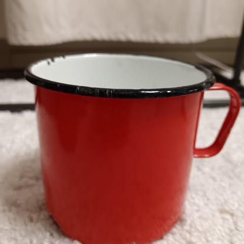 Reunassa ihan pienen pieni rikko, joka ei juurikaan bongaa silmään mukin ollessa hyllyssä (rikko melkein vastapäätä kahvaa).