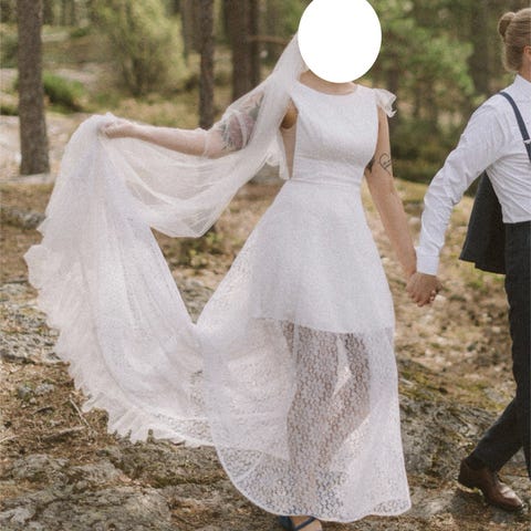 hääpuku kokoa 32. Puvussa on pitkä