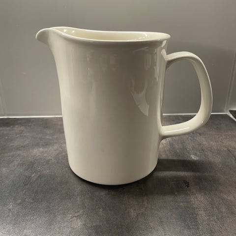 Valkoinen kannu, jossa yläreunassa koristeellinen kuviointi ruskean ja keltaisen sävyissä. Kannussa on kaatonokka ja korvallinen kahva.