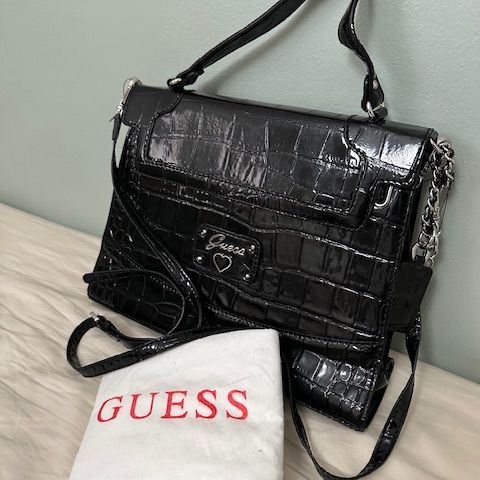 Guessin käyttämätön olkalaukku. Toiseen kantokahvaan on jostain tarttunut tummaa väriä, en tiedä saako pois. Materiaali on tekonahka/kangas.