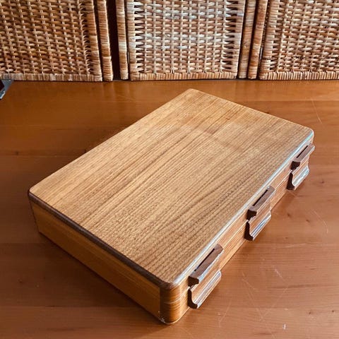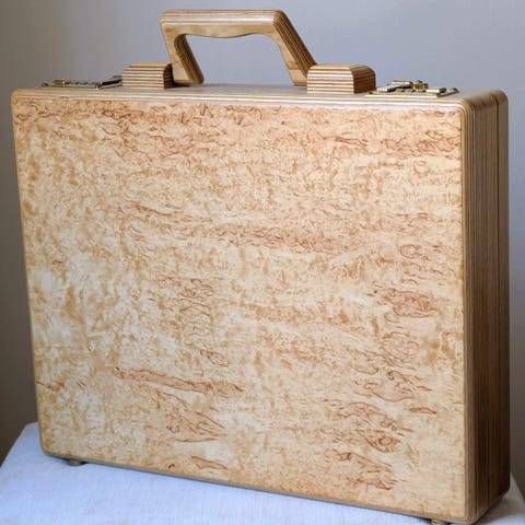 Tyylikäs käsityönä Suomessa valmistettu mahonkisalkku. Sisäpuoli viininpunaista samettia. K 32cm, L 45cm, S 10cm