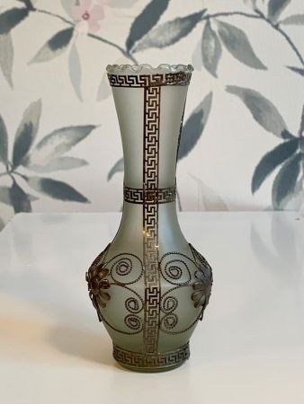 Antiikki Tiffin lasimaljakko. Valmistettu vaaleanpunaisesta satiinilasista ja siinä on käsinmaalattuja kukkakoristeita.