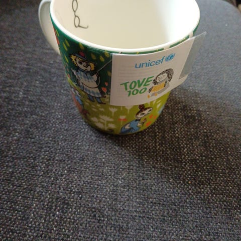 Keräilijöiden unelmamuki! Myynnissä harvinainen "Rillimuki", joka julkaistiin vuonna 2014 Tove Janssonin 100-vuotisjuhlan kunniaksi. Tämä erikoismuki on erityinen sisäpuolen silmälasikuvion ansiosta.
