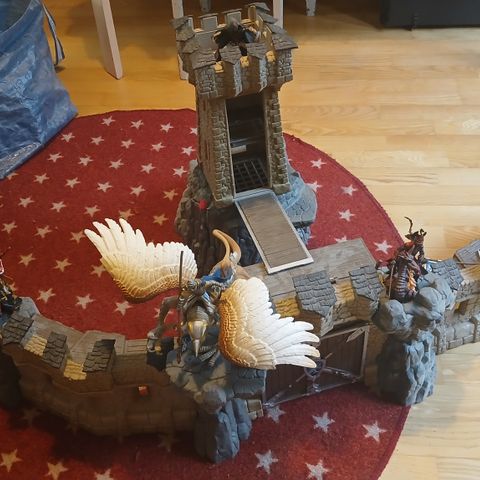 Eli kaikki kuvissa näkyvät linnan osat sekä 4 ritaria, 3 hevosta,katapultteja, kylttejä ymm. Linnaan kaikki osat. Osat valmistanut simba niminen yhtiö.