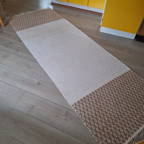Uusi kotikutoinen, jämäkkä räsymatto. Koko; leveys 80 cm ja pituus 2,40 m. Työnjälki tasaista.