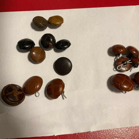 Kuvanmukaiset nahkaiset napit. Mitat 1,3 ja 1,8 cm. Napeissa pieni metallinen kanta.
