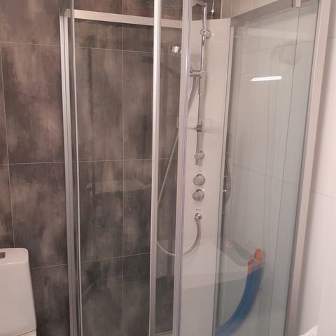Täydellinen paketti: Ympärikatettu suihkukaappi, hana, suihkusetti ja pohja-allas poistoputkineen.