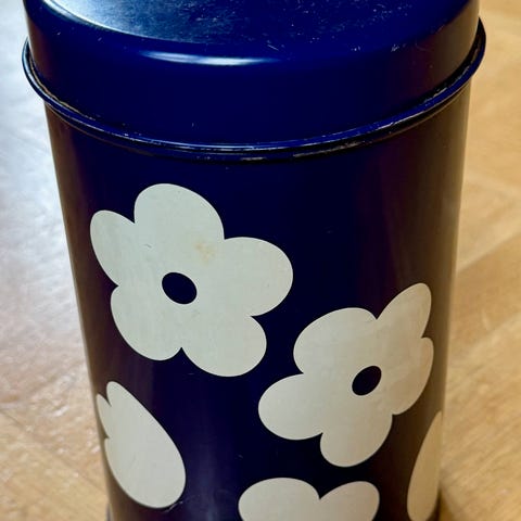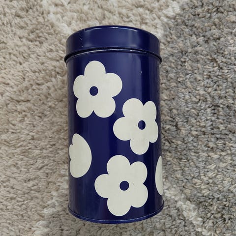 Siistissä kunnossa Aarikka Peltipurkki Kukkaset, tummansininen.