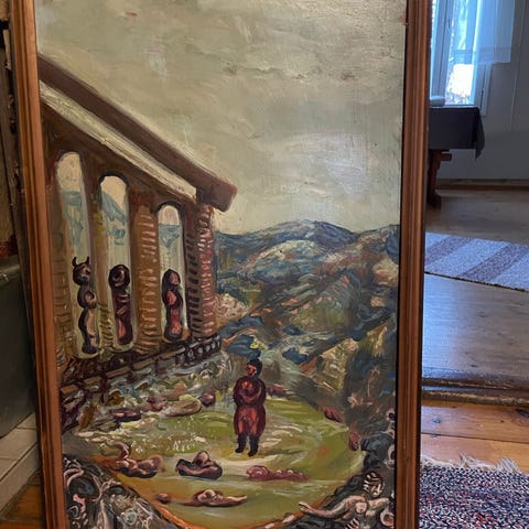 Myydään signeerattu Jaakolan surrealistinen maalaus vuodelta 1986. Työn koko 48*73cm ja kehykset päälle.