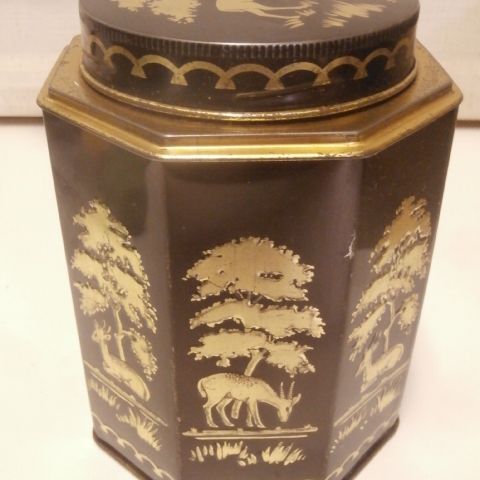 Kaunis vanha kaurisaiheinen kahvipurkki, kannessa sarana. Purkissa on käytön jälkiä ulkopuolella, maalipintaa kulunut. Kauriit kuitenkin vielä näkyvät hyvin. Samanlaiset kauriit kuin purkissa nro 1. Kannessa tummempi sävy, sisäpuoli purkista on melko siisti, pohjassa kahvilusikasta jäänyt naarmuja. Ollut paljon käytössä. 8-kulmainen. Korkeus 14 cm, sivusta sivuun 11,8 cm. Postitus tai nouto.
