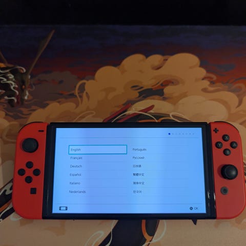 Nintendo Switch -pelikonsolin Mario Red & Blue Edition, näytönsuoja ja Nintendo Switch Deluxe Travel Case -suojalaukku.