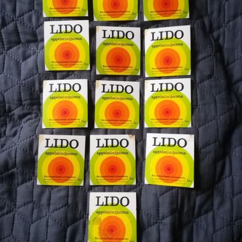 Vanhoja limsapullojen etikettejä, neljä erilaista.